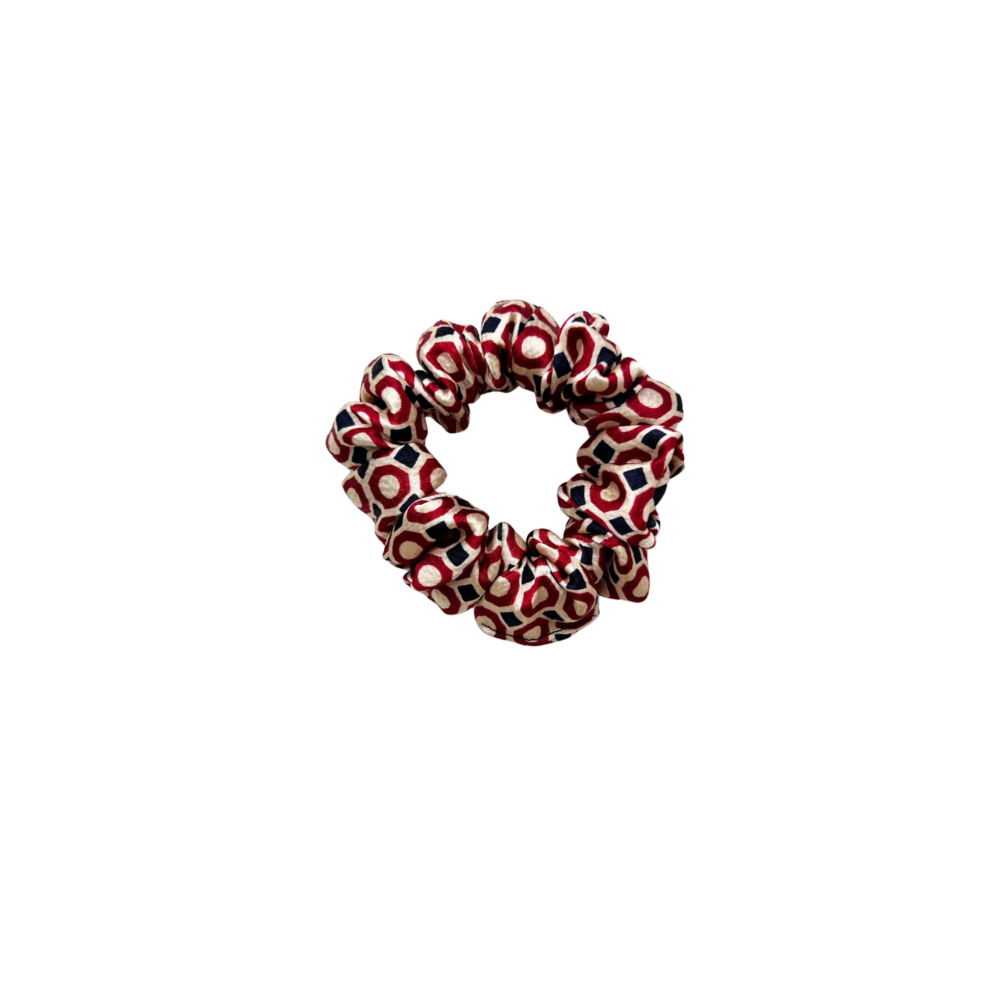 Beige, circle patterned mini scrunchie with red and navy blue accents.