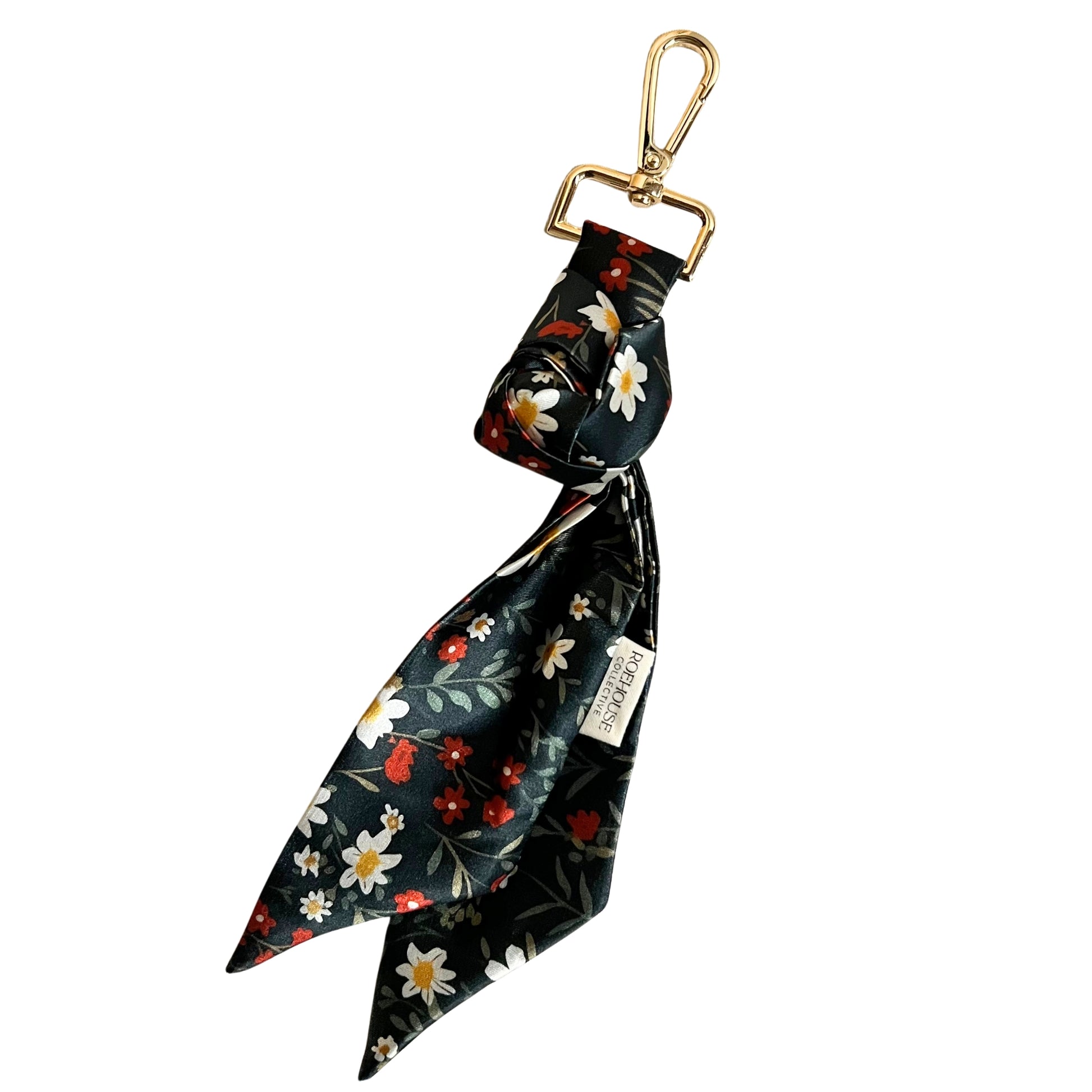 Black bag charm with red and green floral detailing. Perfect for clipping onto a purse or backpack.