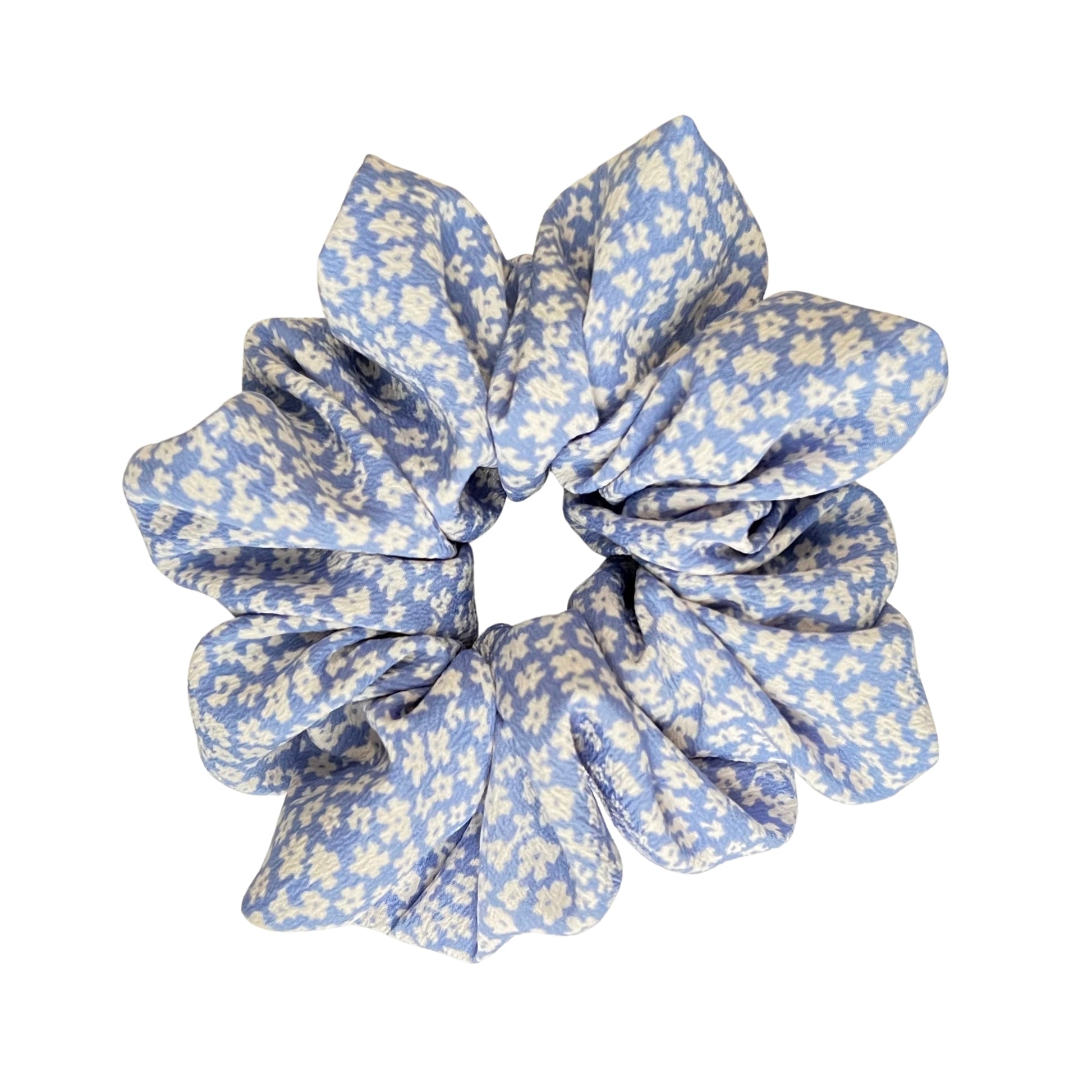 Baby blue oversized scrunchie with dainty white floral design.